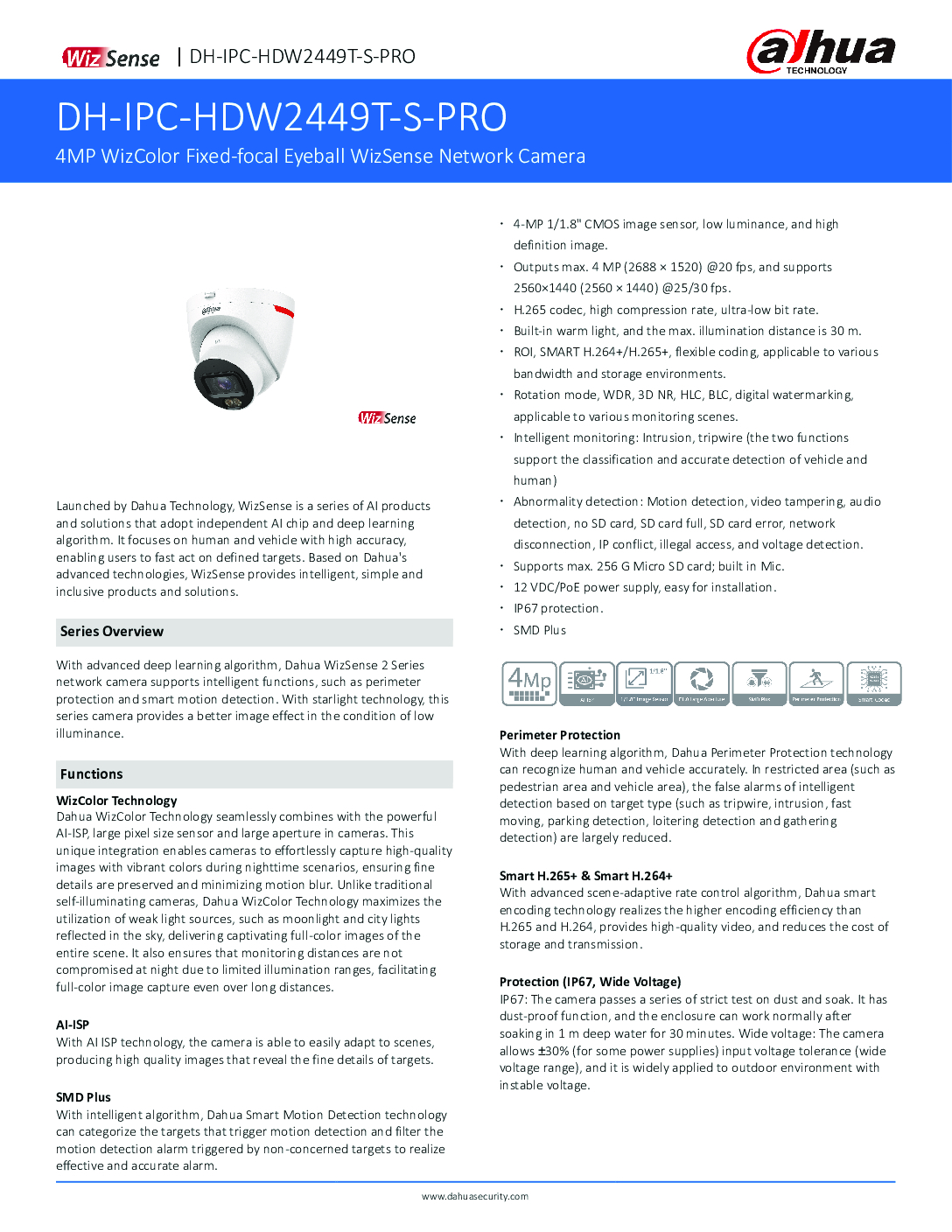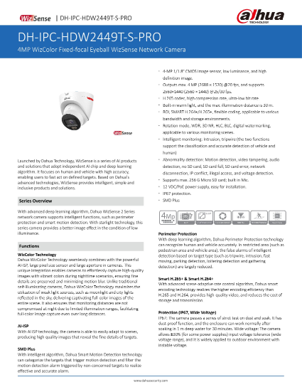 DAHUA IPC-HDW2449T-S-PRO 4MP WizColor Eyeball WizSense Network Camera PoE Mic IP67 Intrusion Tripwire Detection Security system