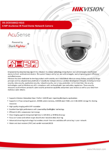 HIKVISION DS-2CD3166G2-IS 6MP AcuSense POE Dome Camera Project Hikvision Embedded Open Platform HEOP 350MB RAM 2GB eMMC