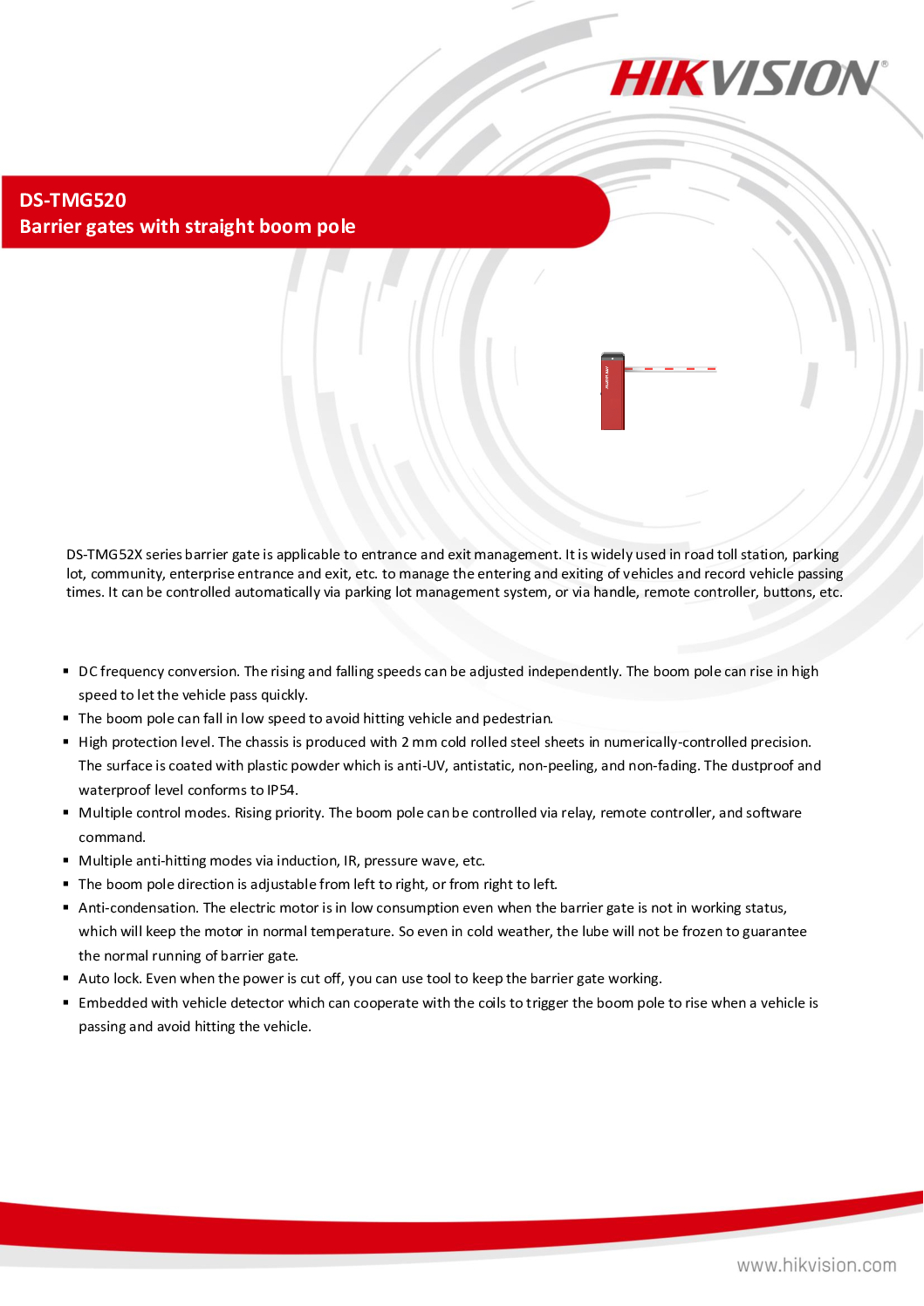 HIKVISION DS-TMG520 Barrier Gates are designed for secure and efficient vehicle access control for commercial buildings, industrial facilities, condominiums, and gated driveways. With a fast response time, heavy-duty motor, and reliable straight boom pole system, the DS-TMG520 offers smooth vehicle entry and exit while maintaining controlled security and traffic flow.