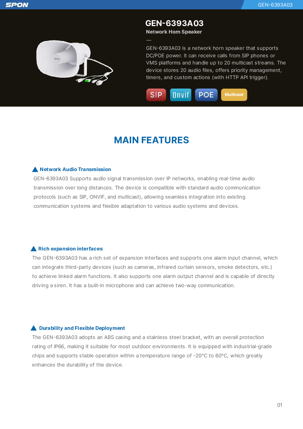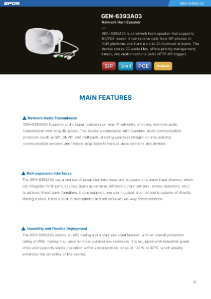 The IP Speaker Horn 15W PoE GEN-6393A03 is a robust, network-based IP Public Address (PA) audio solution designed for crystal-clear voice broadcasting in outdoor and industrial environments. Featuring Power-over-Ethernet (PoE) connectivity and IP66 weatherproof protection, this smart PA speaker delivers reliability, loud performance, and ease of integration with modern IP surveillance and building communication systems.
